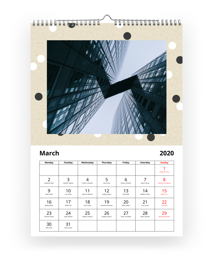 Hozd létre saját naptárad: adj hozzá születésnapokat, évfordulókat és ünnepeket, kedvenc fotóid, és kezdd a tetszőlegesen választott hónappal. Naptárainkat kiváló minőségű papírra nyomtatjuk, és erős spirálkötéssel vannak ellátva.